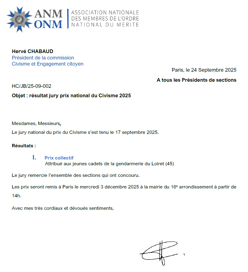 Le Président national, Patrick Sandevoir et le Président de la commission, Hervé Chabaud vous adressent les délibérations du jury par la lettre jointe à ce courriel, pour permettre l'organisation en toute sérénité de la venue des sections primées ainsi que des lauréats et de leurs familles.