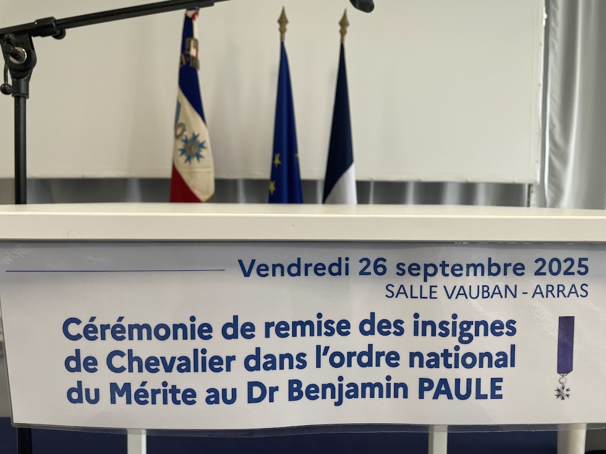 Cet après-midi, les membres de l'ordre national du Mérite ont accompagné Marc DERASSE, trésorier national de l'ANMONM et vice-président du Pas-de-Calais, à la cérémonie de remise des insignes de chevalier de l'ordre national du Mérite au docteur Benjamin PAULE.